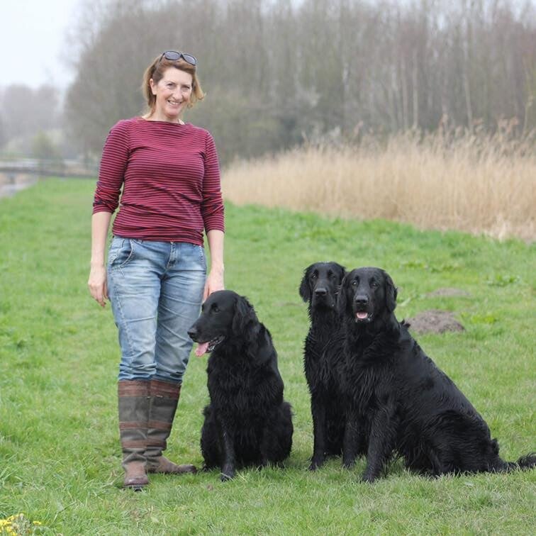 We live in Holland and currently own 3 Flatcoats, 2 boys and one girl. The dogs are our family members and we have a maximum of four, we only breed occasionally. Showing and working the dogs comes with the hobby.